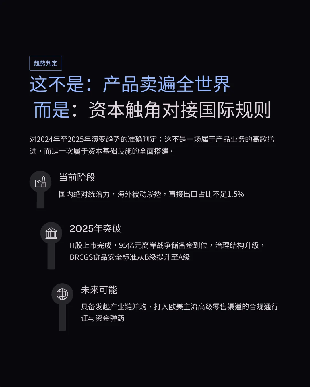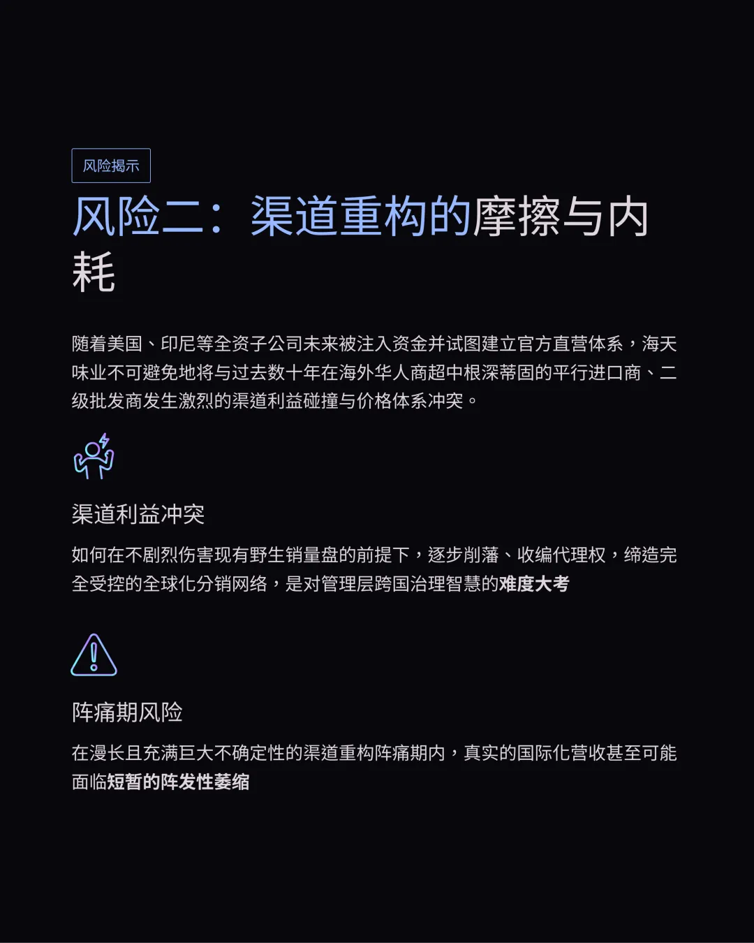 随着未来新设海外分支机构被注入实质资金并尝试建立官方直营体系,公司势必需要重构现有的海外销售渠道,这将不可避免地与过去数十年来根深蒂固于海外商超网络中的平行进口商发生激烈的利益碰撞与价格冲突。