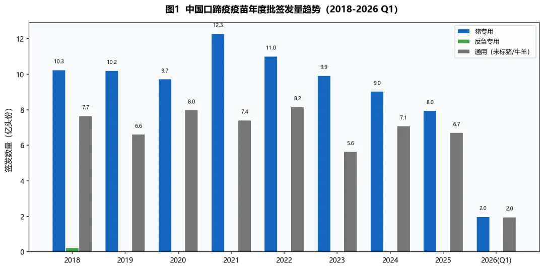 图1中国口蹄疫疫苗年度批签发量趋势(2018-2026 Q1)