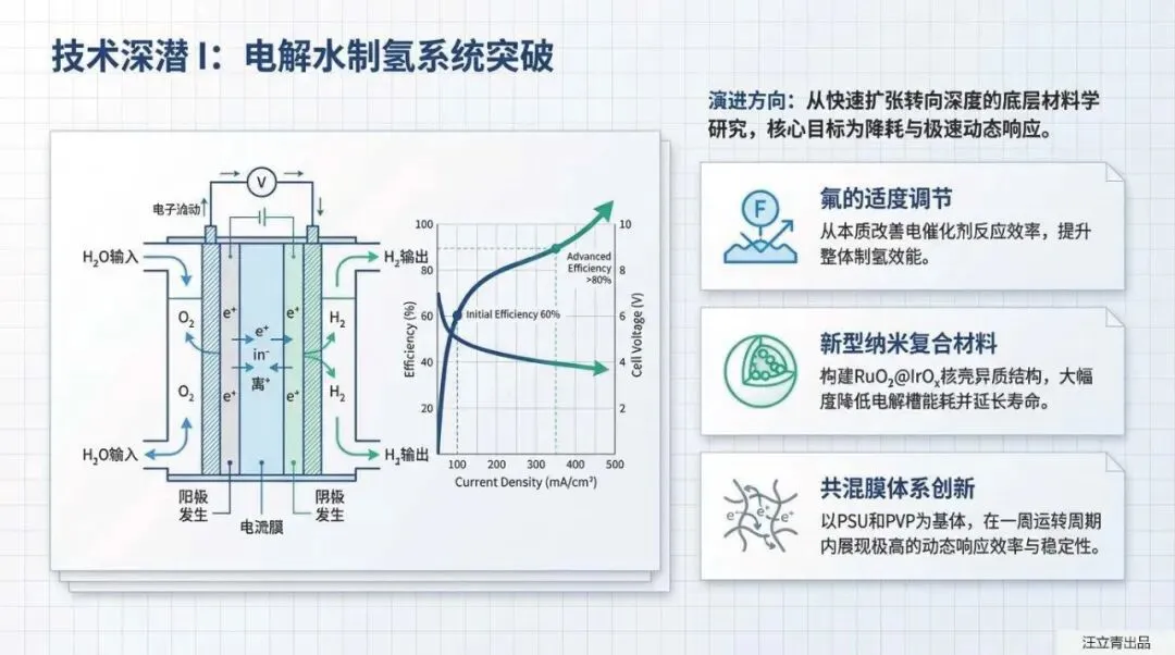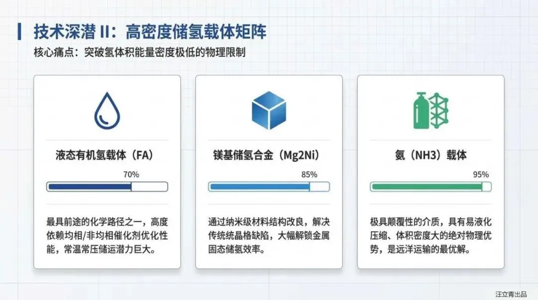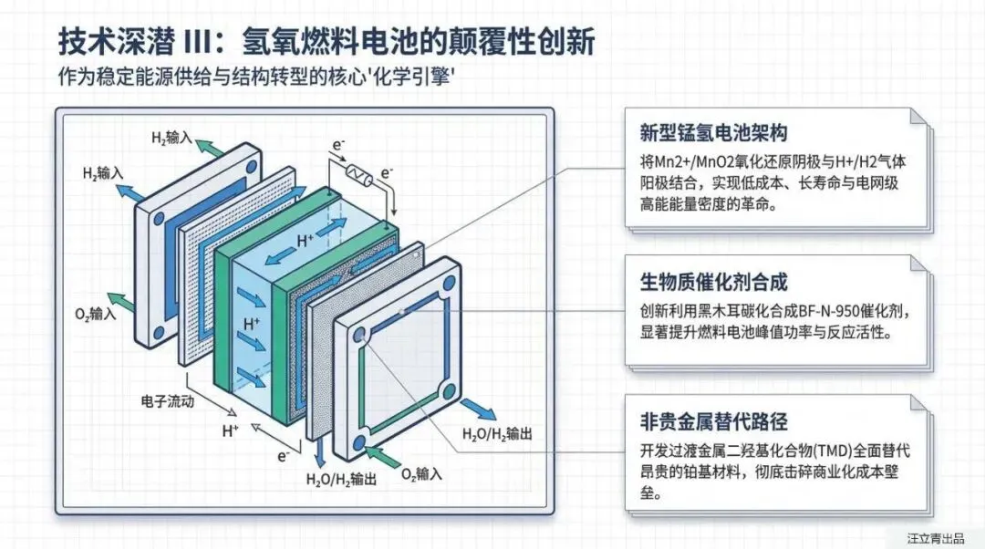 底层技术的原子级突破正以前所未有的速度粉碎系统成本边界。在制氢端,新型RuO2@IrOx核壳异质结构与PSU-PVP共混膜体系完成技术深潜,将研发重心彻底从规模扩张转向极速动态响应与深度降耗。储运端,氨(NH3)载体凭借95%的极高储氢效率确立为远洋运输的最优解,镁基固态合金(Mg2Ni)与液态有机氢载体(FA)则强行打破了传统氢气体体积能量密度的物理限制。而在作为核心“化学引擎”的燃料电池上,新型锰氢电池架构(Mn2+/MnO2阴极与H+/H2阳极结合)协同过渡金属二硫化物(TMD),全面清退昂贵的铂基材料,彻底击碎商业化量产的成本壁垒。