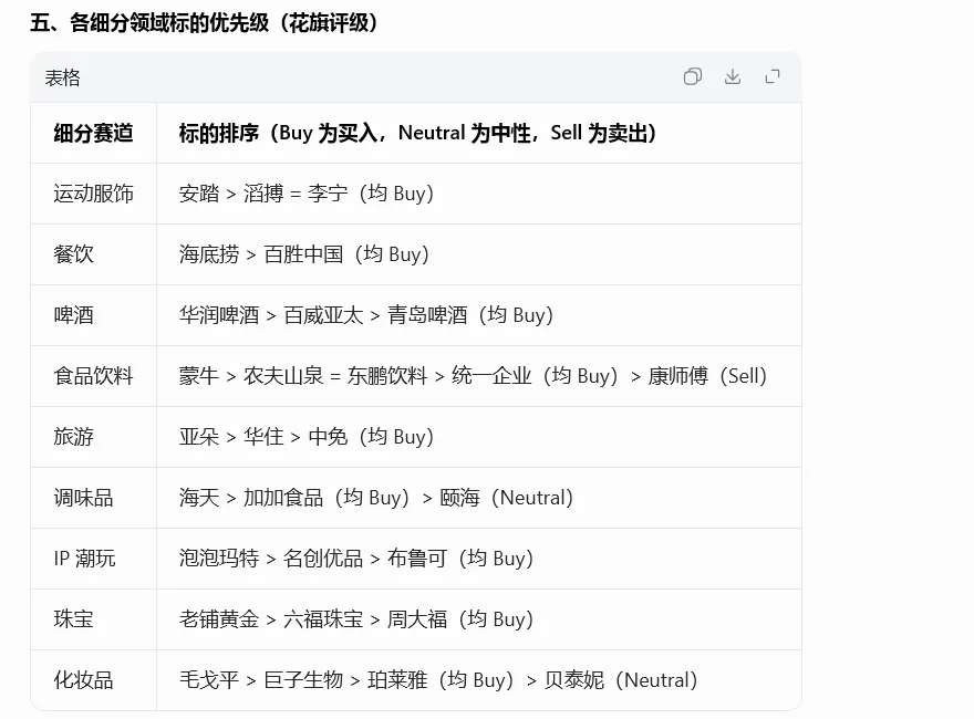 明确 26E 仍维持五大投资主题,看好下游乳制品、运动服饰、休闲餐饮、旅游等赛道的复苏,同时给出各细分领域的标的优先级,以下是核心总结: