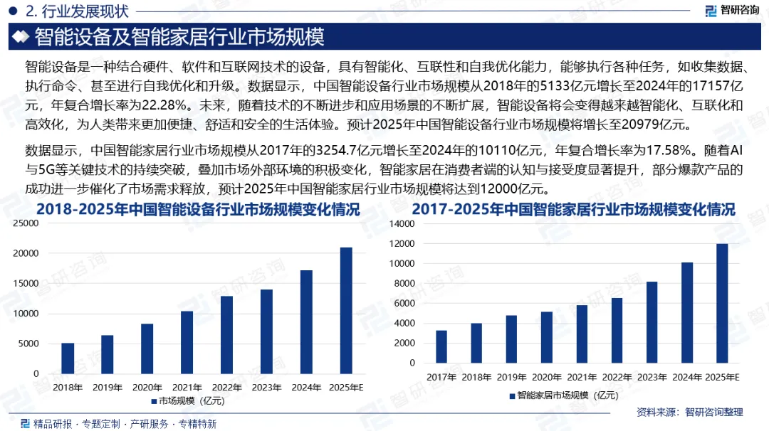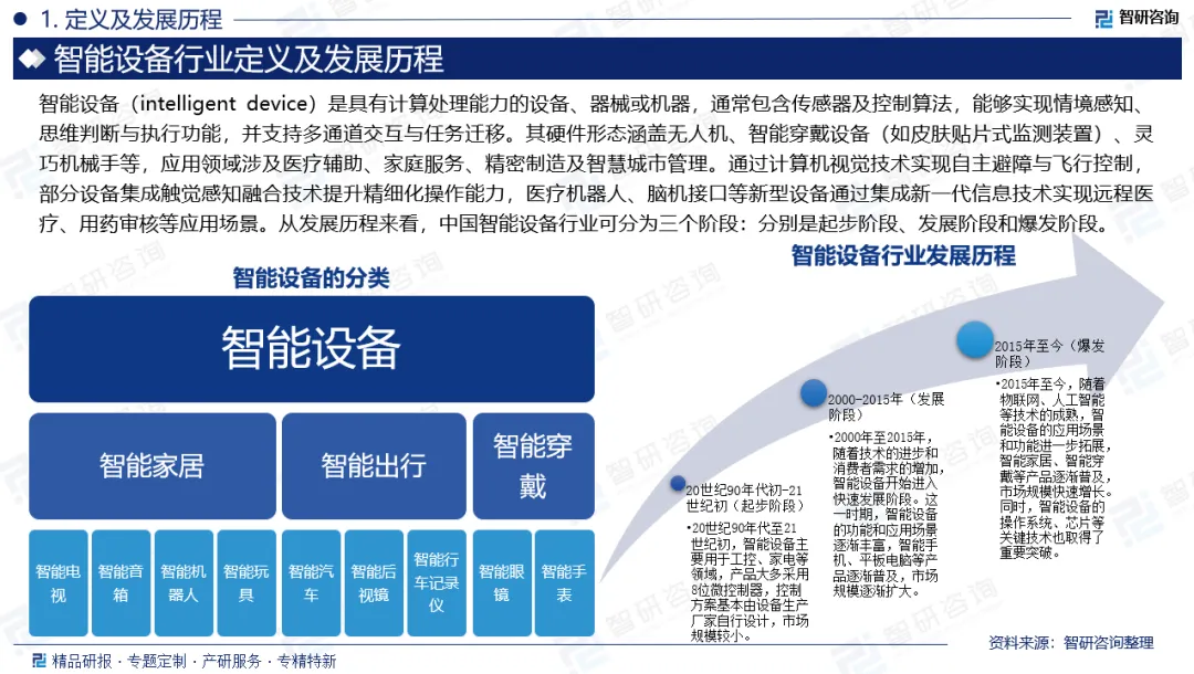 行业政策:随着人工智能、物联网等技术的不断发展,智能设备市场得到了迅速的发展,在现代社会中已经扮演了重要的角色。为推动智能设备进一步发展,国家有关部门发布一系列政策和措施。例如,2024年1月,工业和信息化部等九部门印发《原材料工业数字化转型工作方案(2024—2026年)》,支持原材料行业龙头企业和“链主”企业建设数据驱动、可信交互的产业链协作平台,与配套中小企业共享智能设备、智能仪器、智能仪表、数字化软件、工业APP等数字技术产品,向中小企业开放市场、平台、物流等资源。2025年8月,国务院印发《关于深入实施“人工智能+”行动的意见》,推动智能终端“万物智联”,培育智能产品生态,大力发展智能网联汽车、人工智能手机和电脑、智能机器人、智能家居、智能穿戴等新一代智能终端,打造一体化全场景覆盖的智能交互环境。