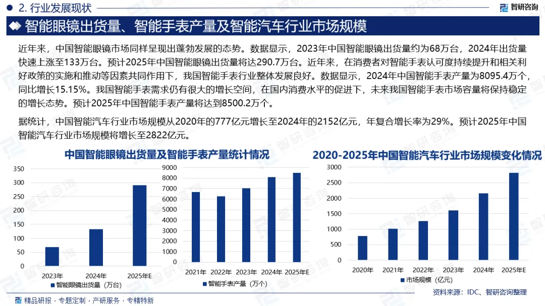 智能眼镜出货量:智能穿戴主要包括智能眼镜、智能手表、智能健康手环等。智能眼镜以传统眼镜的形态为载体,通过集成各类智能硬件与软件系统,实现信息交互、功能扩展等智能化应用。随着可穿戴设备的快速发展,眼镜作为新的载体被智能化,智能眼镜不仅在工业、军事安防、应急抢险等领域得到广泛应用,在大众健康监测领域的应用也越来越多。作为眼镜生产大国,中国智能眼镜市场环境具有发展潜力大,未来市场规模增长率高等特点。近年来,中国智能眼镜市场同样呈现出蓬勃发展的态势。数据显示,2023年中国智能眼镜出货量约为68万台,2024年出货量快速上涨至133万台。2025年中国智能眼镜出货量将达290.7万台。智能眼镜市场是一块有巨大挖掘空间的沃土,发展潜力巨大。随着人工智能大模型与光波导技术的日渐成熟,未来智能眼镜通过结合语音助手、实时翻译、健康监测等功能,将成为日常生活和职业场景中的智能助手。