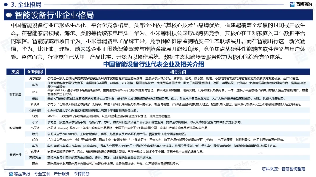 企业格局:中国智能设备行业已形成生态化、平台化竞争格局,头部企业依托其核心技术与品牌优势,构建起覆盖全场景的封闭或开放生态。在智能家居领域,海尔、美的等传统家电巨头与华为、小米等科技公司形成跨界竞争,其核心在于对家庭入口与数据平台的掌控。智能穿戴市场由华为、小米等消费电子品牌主导,竞争围绕健康监测精度与生态联动展开。而在智能出行这一新兴赛道,华为、比亚迪、理想、蔚来等企业正围绕智能驾驶与座舱系统展开激烈角逐,竞争焦点从硬件性能转向软件定义与用户体验。整体而言,行业竞争已从单一产品比拼,升级为以操作系统、数据生态和跨场景服务能力为核心的综合竞争体系。