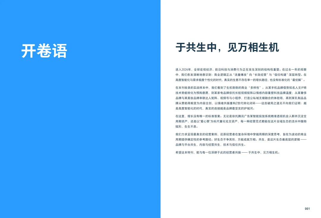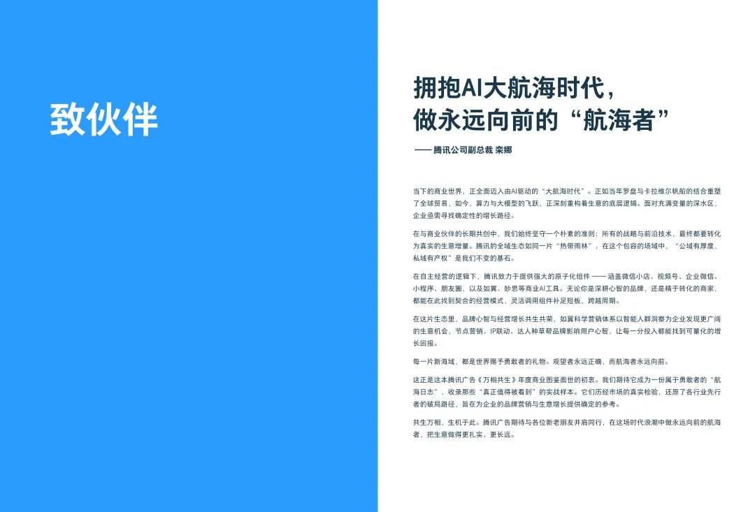 《万相共生》作为腾讯广告2025年度商业图鉴,聚焦AI驱动的商业“大航海时代”,核心展现了品牌与平台、内容与经营、技术与信任共生的全域生态经营逻辑,为企业提供了确定性增长路径。