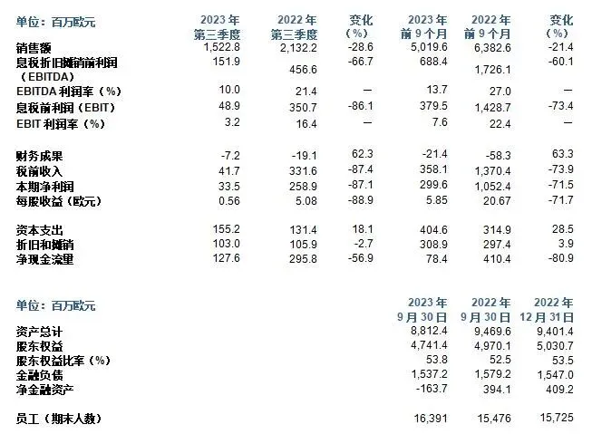 2023年第三季度集团销售额为15.2亿欧元,比上年同期下降29%