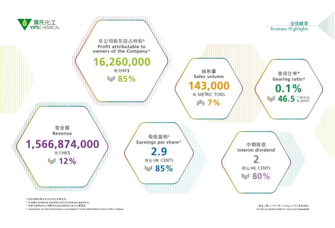 • 集团整体财务状况维持良好,受惠于出售溶剂业务51%实际权益的所得款项,于回顾期内期末集团借贷比率只有0.1%。