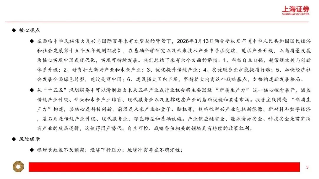 在面临中华民族伟大复兴与国际百年未有之变局的背景下,2026年3月13日两会受权发布《中华人民共和国国民经济和社会发展第十五个五年规划纲要》,在基础科学研究以及未来技术产业中寻求突破,追求产业升级,以高质量发展为核心实现中国式现代化,实现可持续发展。我们总结下来有六个方面的举措: