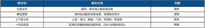 公司业务清晰简单,航运服务模式透明,上下游关系明确,符合能力圈原则。主要经营东北亚(中日)、东南亚、两岸航线,服务模式为"定时、定线、定港、定班"精品航运。