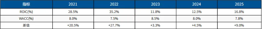 近5年ROIC持续高于WACC,说明公司创造真实股东价值。2025年ROIC约16.8%,差值9.0%,资产运营效率良好。周期低点(2023)仍保持正值。