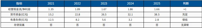 连续5年经营现金流/净利润>1,货币资金充裕(38.5亿),有息负债极低(2.8亿),存贷双高为否,财务健康度优秀。