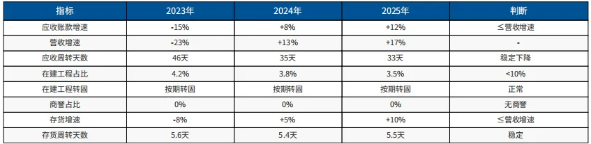 应收账款增速低于营收增速,周转天数稳定;在建工程占比低且按期转固;无商誉减值风险;存货周转高效。资产真实可靠。