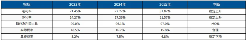 毛利率、净利率持续上升,盈利能力增强;扣非净利润占比>97%,主业清晰;实际税率合理,三费费率稳定下降,利润质量高。
