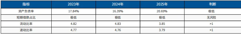 资产负债率仅20.69%,远低于行业平均;流动比率3.85,速动比率3.79,短期偿债能力极强;无有息负债压力,财务结构非常健康。
