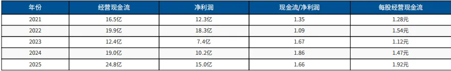 【现金流质量】连续5年经营现金流/净利润>1,盈利质量优秀;2025年经营现金流24.8亿元,同比+30.5%,现金流充沛支持分红和扩张。