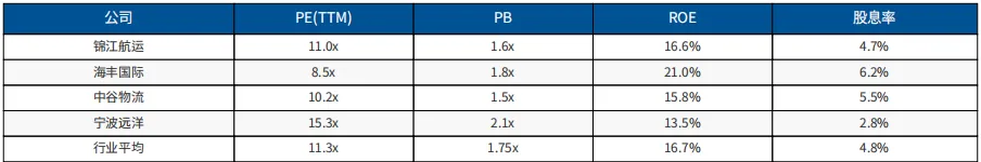 【相对估值】锦江航运PE与行业平均相当,ROE处于行业前列;股息率4.7%高于行业平均,具备较好的分红回报。
