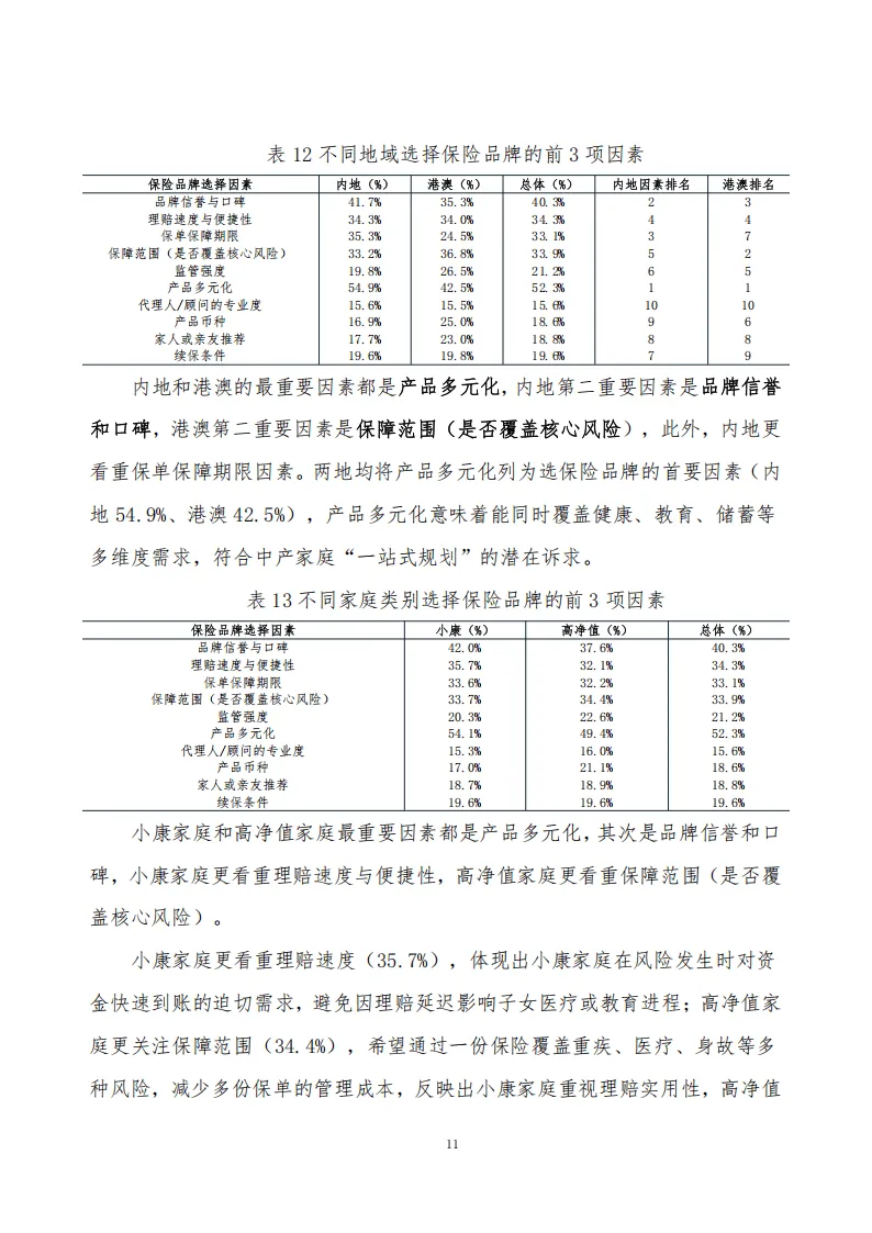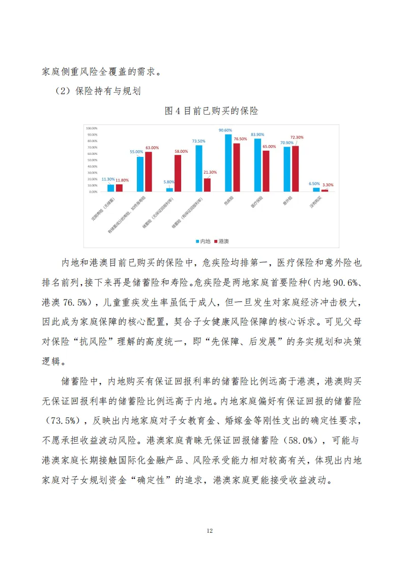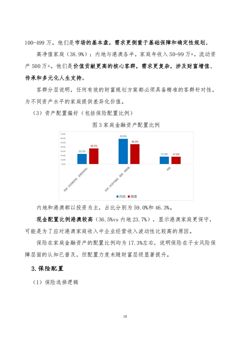 调研显示,受访中产家庭父母以36-45岁中年群体为主,学历偏高,子女多处于成长阶段,内地与港澳家庭在财富规模、收入结构上存在明显差异,且可划分为侧重基础保障的内地小康家庭和需求多元的高净值家庭两类客群。保险在家庭金融资产配置中占比稳定,两地家庭均秉持“先保障后发展”原则,危疾险为核心配置,内地偏爱有保证回报的储蓄险,港澳更接受无保证回报类型,且高净值家庭保险购买意向更高。