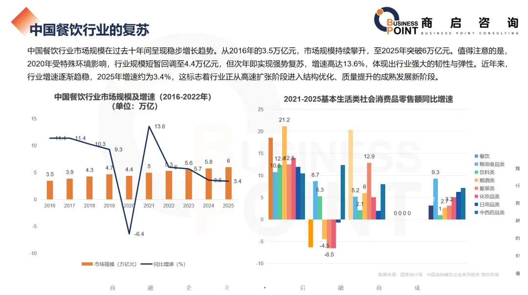 中国餐饮行业市场规模在过去十年间呈现稳步增长趋势。从2016年的3.5万亿元,市场规模持续攀升,至2025年突破6万亿元。值得注意的是,2020年受特殊环境影响,行业规模短暂回调至4.4万亿元,但次年即实现强势复苏,增速高达13.6%,体现出行业强大的韧性与弹性。近年来,行业增速逐渐趋稳,2025年增速约为3.4%,这标志着行业正从高速扩张阶段进入结构优化、质量提升的成熟发展新阶段。