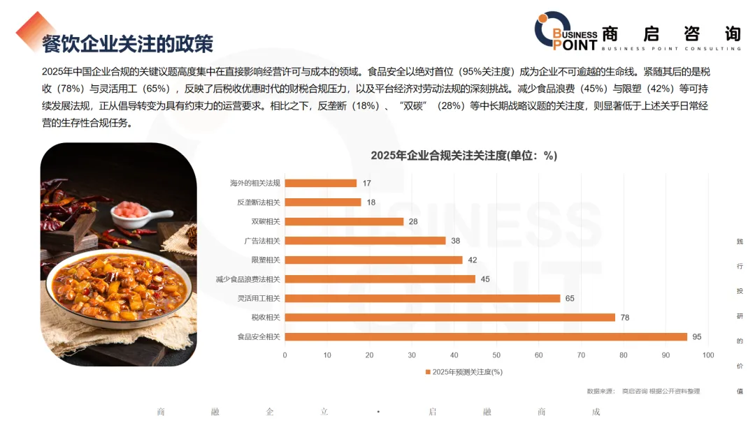 2025年中国企业合规的关键议题高度集中在直接影响经营许可与成本的领域。食品安全以绝对首位(95%关注度)成为企业不可逾越的生命线。紧随其后的是税收(78%)与灵活用工(65%),反映了后税收优惠时代的财税合规压力,以及平台经济对劳动法规的深刻挑战。减少食品浪费(45%)与限塑(42%)等可持续发展法规,正从倡导转变为具有约束力的运营要求。相比之下,反垄断(18%)、“双碳”(28%)等中长期战略议题的关注度,则显著低于上述关乎日常经营的生存性合规任务。