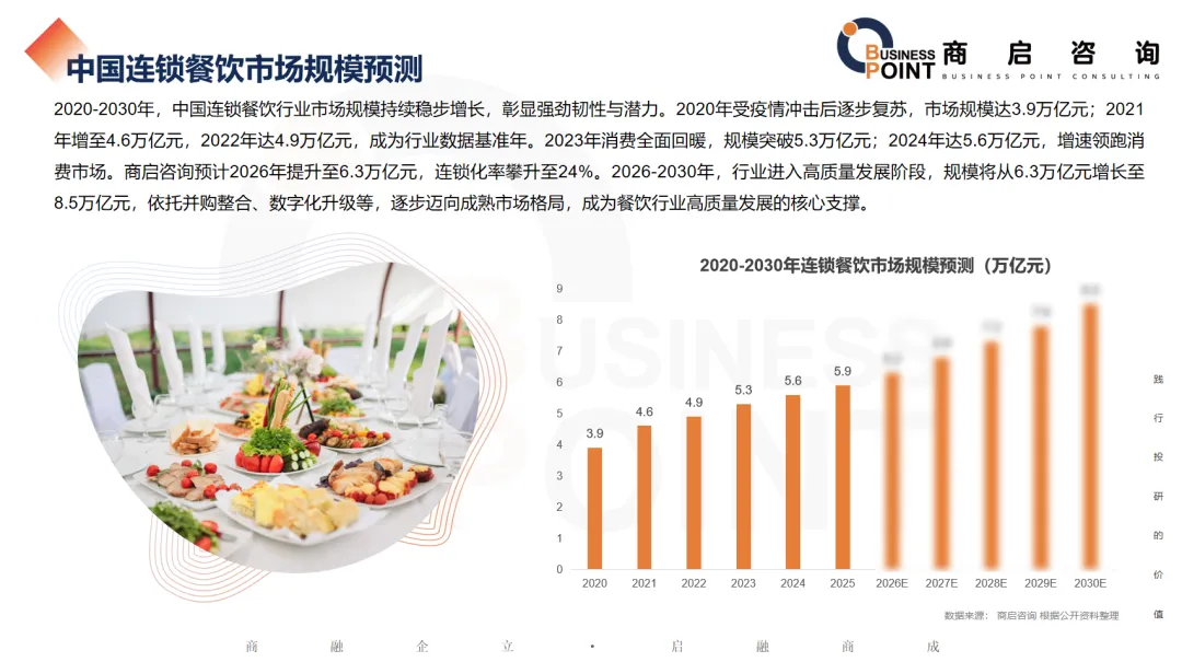 2020-2030年,中国连锁餐饮行业市场规模持续稳步增长,彰显强劲韧性与潜力。2020年受疫情冲击后逐步复苏,市场规模达3.9万亿元;2021年增至4.6万亿元,2022年达4.9万亿元,成为行业数据基准年。2023年消费全面回暖,规模突破5.3万亿元;2024年达5.6万亿元,增速领跑消费市场。商启咨询预计2026年提升至6.3万亿元,连锁化率攀升至24%。2026-2030年,行业进入高质量发展阶段,规模将从6.3万亿元增长至8.5万亿元,依托并购整合、数字化升级等,逐步迈向成熟市场格局,成为餐饮行业高质量发展的核心支撑。