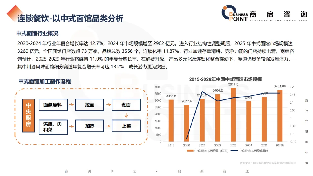 2020-2024 年行业年复合增长率达 12.7%,2024 年市场规模增至 2962 亿元。进入行业结构性调整期后,2025 年中式面馆市场规模达 3260 亿元,全国面馆门店数超 73 万家,品牌总数 3556 个,连锁化率 11.87%,行业加速存量精耕,竞争力弱的门店持续出清。商启咨询预计,2025-2029 年行业将维持 11.0% 的年复合增长率,在消费升级、产品多元化及连锁化整合推动下,赛道仍具备较强发展潜力,其中川渝风味面馆细分赛道年复合增长率可达 13.2%,成长潜力更为突出。