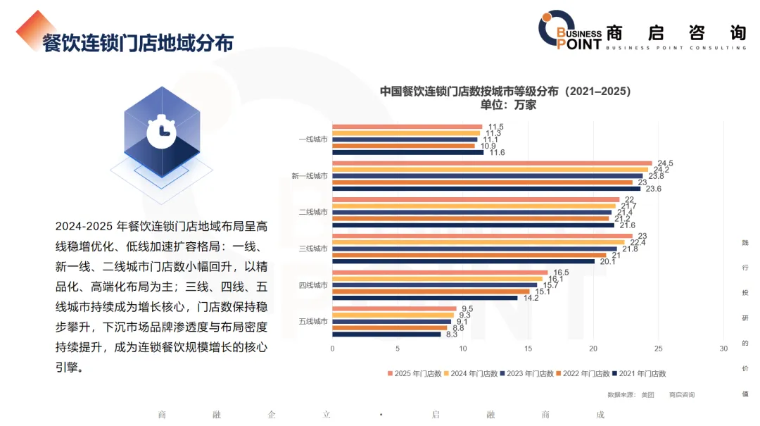 2024-2025 年餐饮连锁门店地域布局呈高线稳增优化、低线加速扩容格局:一线、新一线、二线城市门店数小幅回升,以精品化、高端化布局为主;三线、四线、五线城市持续成为增长核心,门店数保持稳步攀升,下沉市场品牌渗透度与布局密度持续提升,成为连锁餐饮规模增长的核心引擎。
