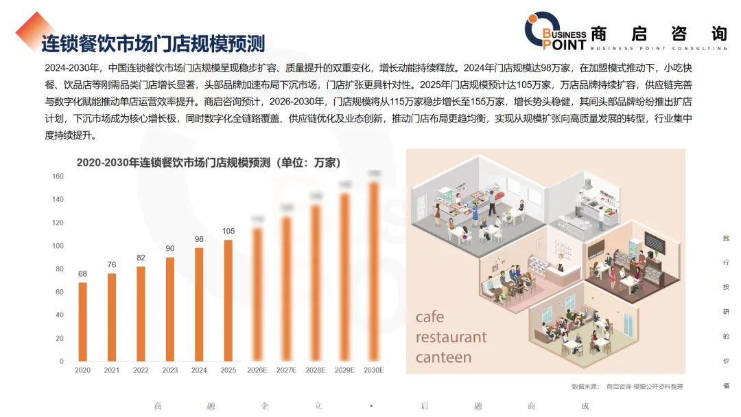 2024-2030年,中国连锁餐饮市场门店规模呈现稳步扩容、质量提升的双重变化,增长动能持续释放。2024年门店规模达98万家,在加盟模式推动下,小吃快餐、饮品店等刚需品类门店增长显著,头部品牌加速布局下沉市场,门店扩张更具针对性。2025年门店规模预计达105万家,万店品牌持续扩容,供应链完善与数字化赋能推动单店运营效率提升。商启咨询预计,2026-2030年,门店规模将从115万家稳步增长至155万家,增长势头稳健,其间头部品牌纷纷推出扩店计划,下沉市场成为核心增长极,同时数字化全链路覆盖、供应链优化及业态创新,推动门店布局更趋均衡,实现从规模扩张向高质量发展的转型,行业集中度持续提升。