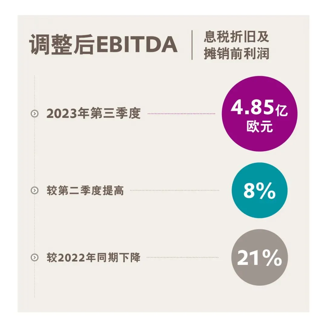 得益于严格的成本控制措施,赢创2023年第三季度调整后息税折旧及摊销前利润(EBITDA)较第二季度增长8%,为4.85亿欧元。然而,由于需求持续疲软,调整后EBITDA仍较去年同期下降21%。