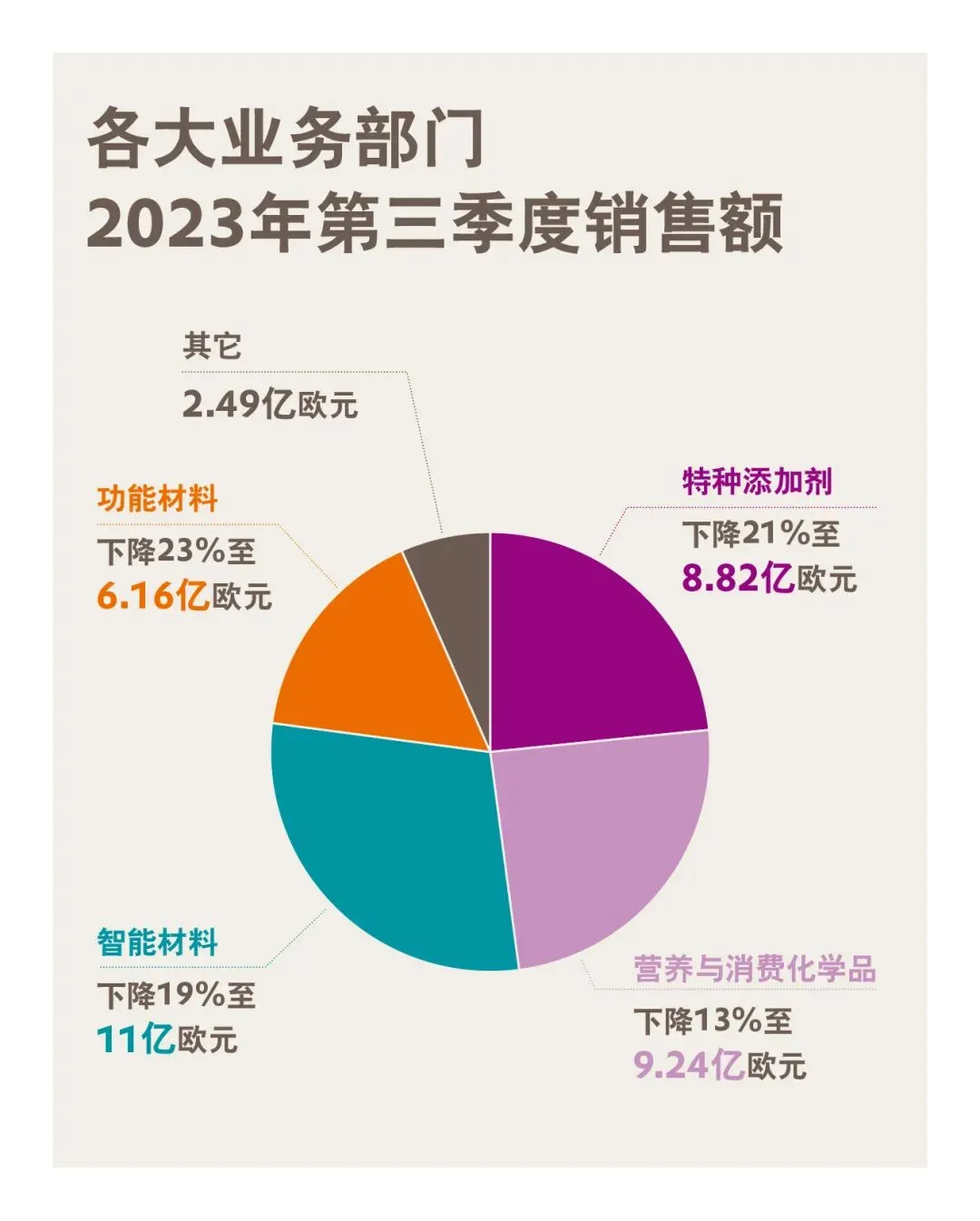 由于销量下降、汇率的负面影响以及售价疲软,2023年第三季度销售额下降19%,为11亿欧元。售价疲软部分是由于原材料成本下降。由于需求下降,无机产品的销售额大幅下降。受原材料成本下降的影响,售价也有所下降。第二季度,两座聚酰胺12生产设施维护工作完成并投入使用,从而对高性能聚合物业务产生了积极影响。销售额与去年大致持平。智能材料业务部门调整后EBITDA下降28%,为1.35亿欧元。这主要是由于销量和售价的下降,然而可变成本的下降则产生了一定的抵消作用。调整后EBITDA利润率从去年同期的13.8%降至12.3%。