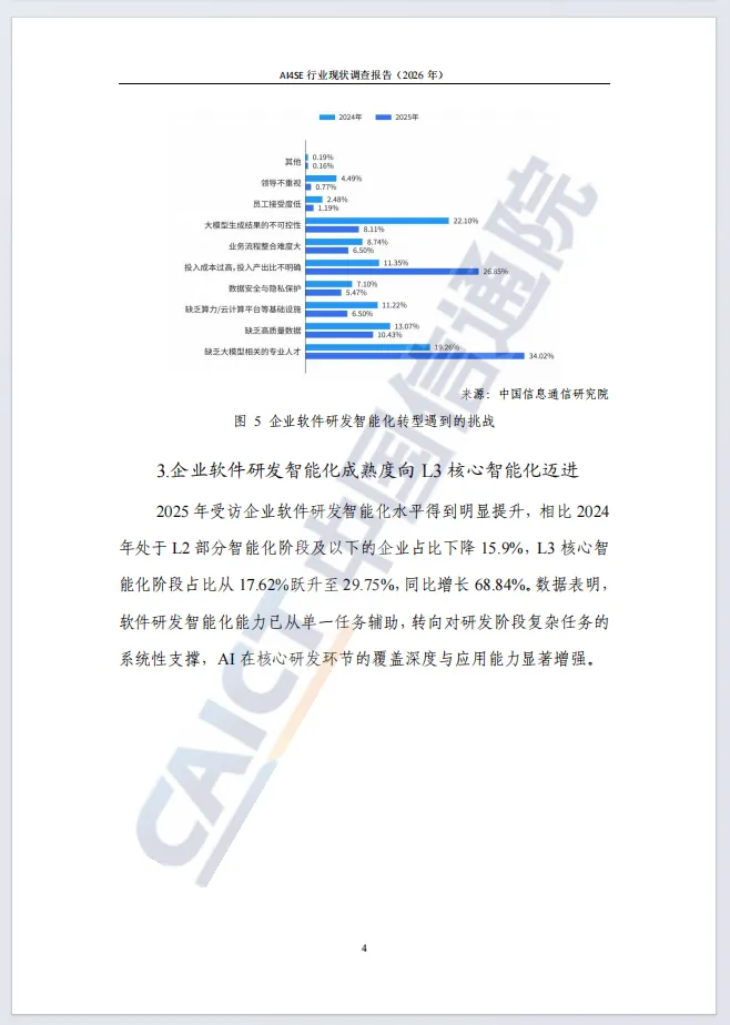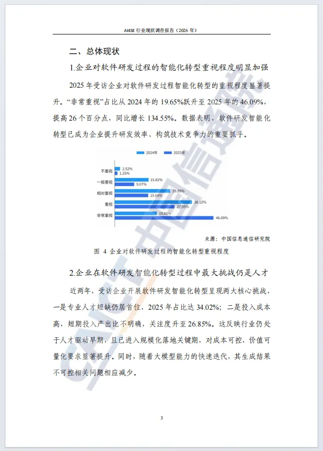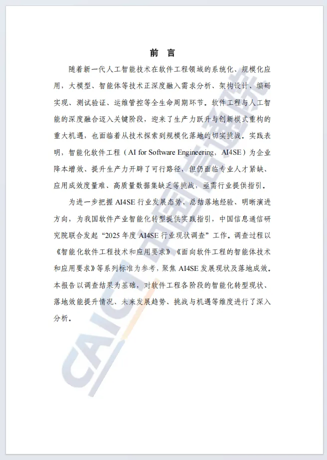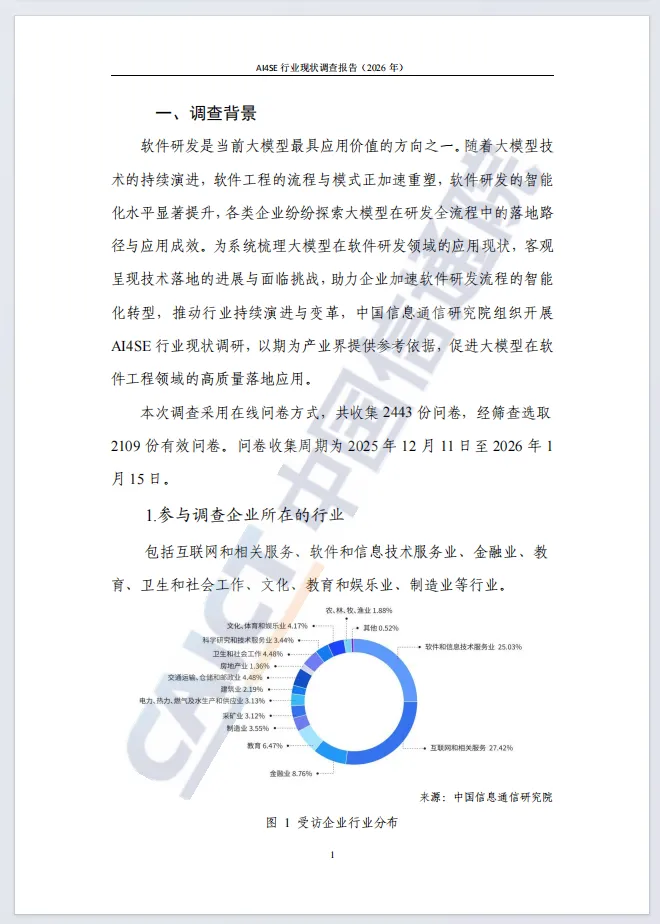 《AI4SE行业现状调查报告(2026年)》由中国信息通信研究院编制,基于2109份有效问卷调研,系统梳理2026年大模型在软件工程领域的应用现状、成效与挑战。
