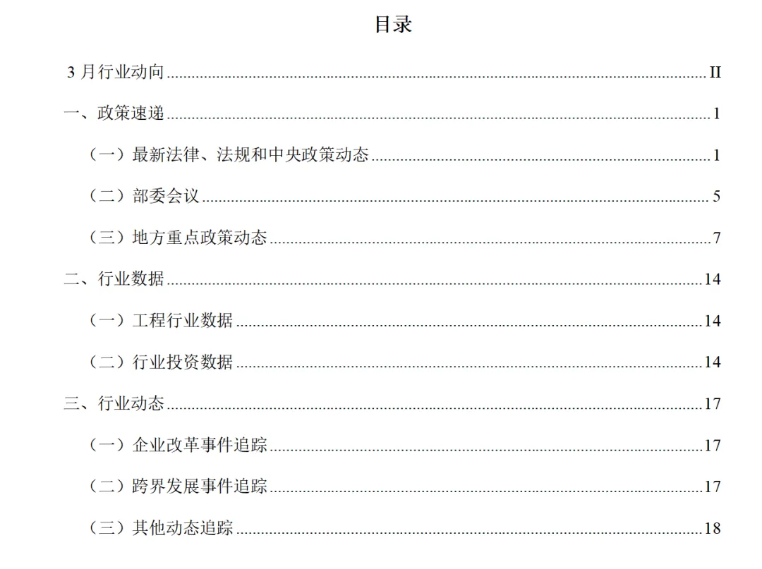 《科思顿工程行业月度观察(2026年3月)》全文共23页,约15363多字,包含重点政策简介和官方链接。其中主要内容包括政策速递、行业数据、行业动态,具体如下: