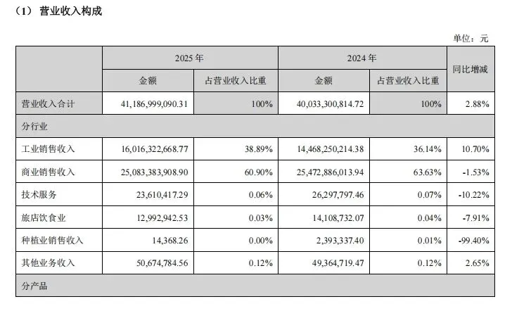 其中,商业销售业务全年实现收入250.83亿元,占总营收比重超60%,但该业务毛利率仅为6.69%,属于低毛利、低附加值的渠道业务,对公司利润贡献有限。