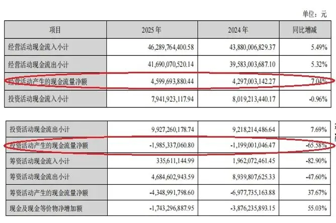 尽管经营活动产生的现金流量净额实现45.99亿元,同比小幅增长7%,但投资活动产生的现金流量净额减少19.85亿元,同比增长了66%,大规模的投资理财、并购支出,让公司流动性储备持续收缩。