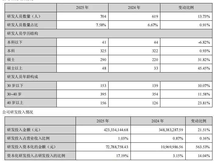 研发费用仅增长3.89%,而研发人员数量增长13.73%至704人,人均研发费用反而同比下降,研发资源分散且投入强度不足。