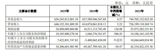 4月2日,上汽集团发布2025年年度报告。报告显示,公司全年实现合并营业总收入6562.4亿元,同比增长4.6%;归属于上市公司股东的净利润101.1亿元,同比大幅增长506.5%;归属于上市公司股东的扣除非经常性损益的净利润74.2亿元,同比增长237.2%。