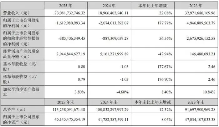 2025年度,赣锋锂业实现营业收入230.82亿元,同比增长22.08%;归属于上市公司股东的净利润16.13亿元,同比增长177.77%。