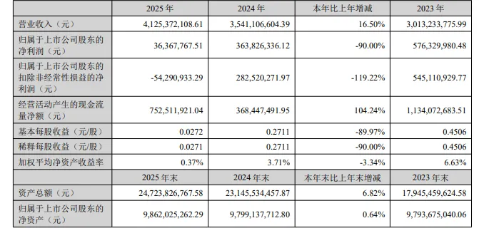 3月31日,星源材质发布2025年年度报告。报告期内,公司实现营业收入41.25亿元,同比增长16.50%;归属于母公司所有者的净利润为0.36亿元,同比下降90.00%。