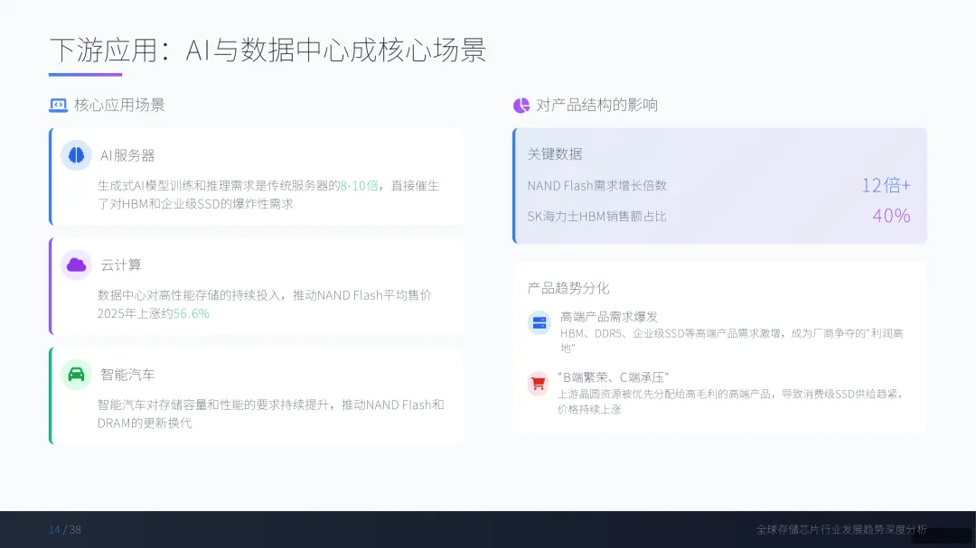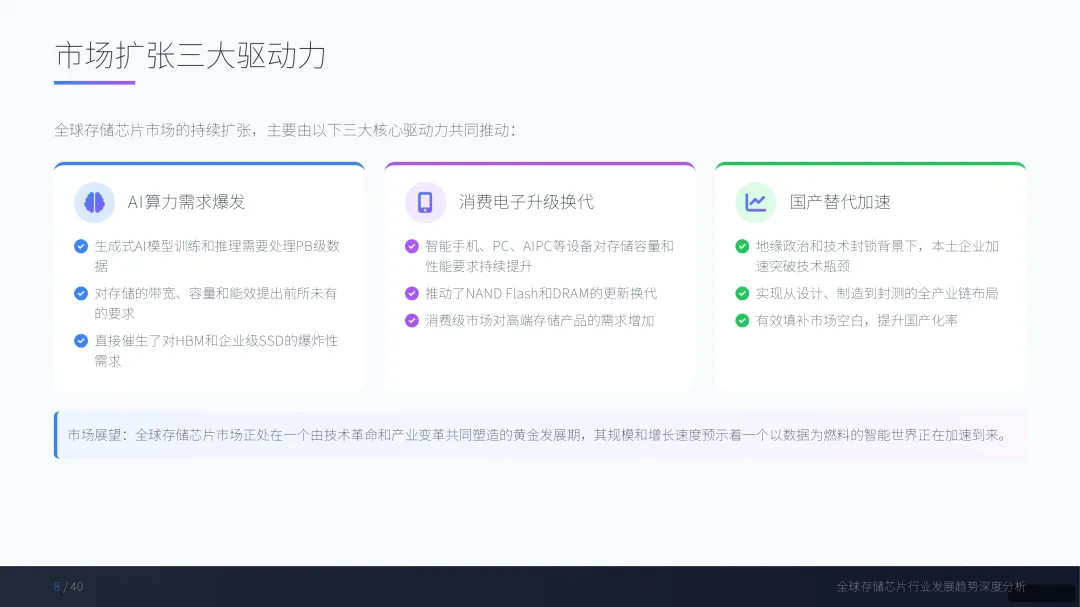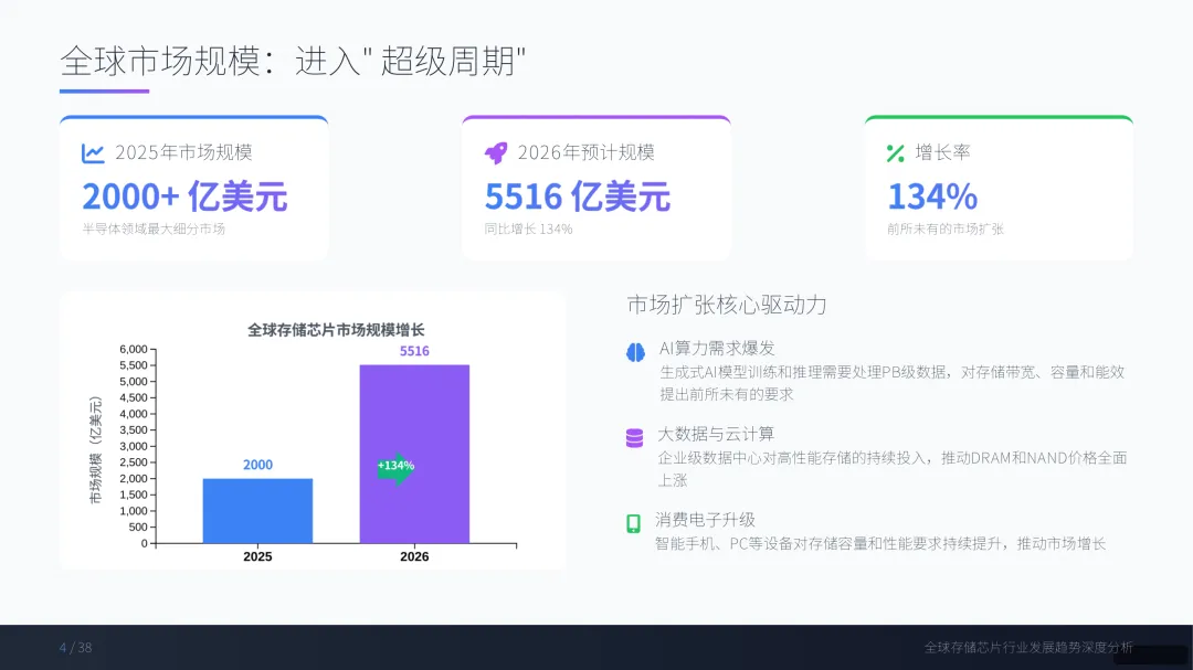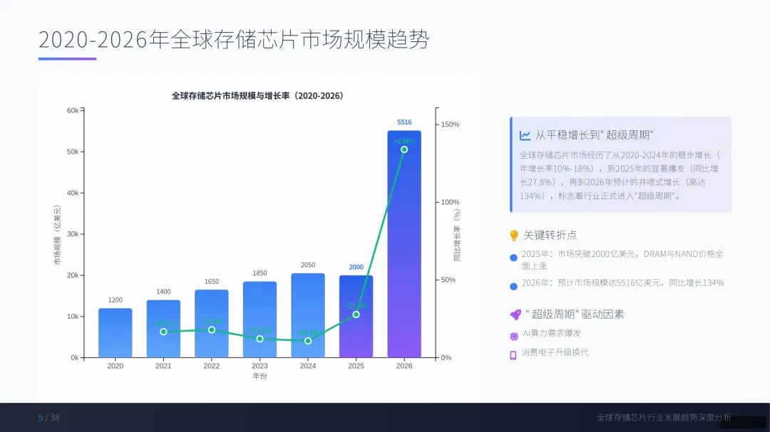 人工智能正驱动全球存储芯片市场进入“超级周期”,预计2026年市场规模将达5516亿美元,同比增长134%,其中高带宽内存(HBM)成为增长最快的细分领域。这份报告深入剖析了存储芯片行业的市场规模、产业链结构、竞争格局和技术演进。AI算力需求爆发是此次“超级周期”的根本驱动力,其对存储的需求是传统服务器的8-10倍,对NAND闪存的需求更是提升了12倍以上。这不仅是周期性复苏,而是由AI定义的结构性高景气。