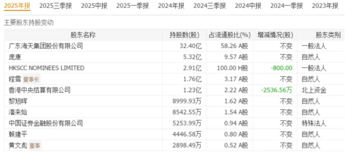 从股东结构看,海天味业的筹码集中度高,前十大股东持股高达80%,其中约70%由庞康等创始人团队牢牢锁定,市场上真正可交易的流通盘仅约21%。