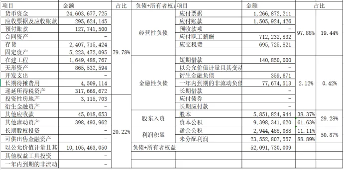 从资产负债表左侧我们可以看出,经营资产构成企业价值创造的主体,海天味业是一家以经营为主的制造业企业,经营性资产占比79.78%。