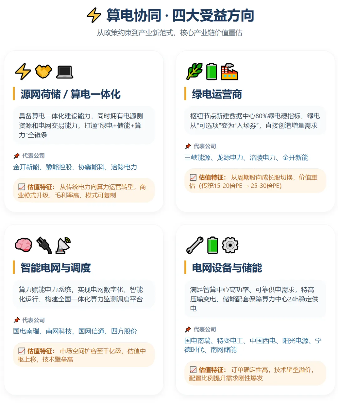 根据国盛证券等机构研报,算电协同产业链可以清晰划分为四大受益方向: