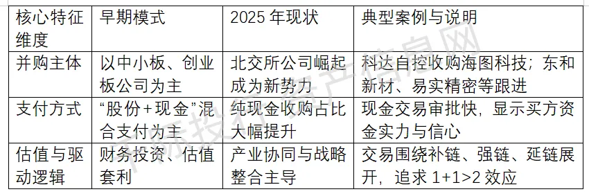 市场估值逻辑彻底告别了早期的估值套利模式,全面转向以产业协同和价值创造为主导。无论是北交所公司收购技术型新三板企业,还是传统行业上市公司通过并购实现转型升级,交易双方均高度强调业务互补、技术融合与产业链延伸。基于产业整合的纵向、横向及混合型并购已成为绝对主流。