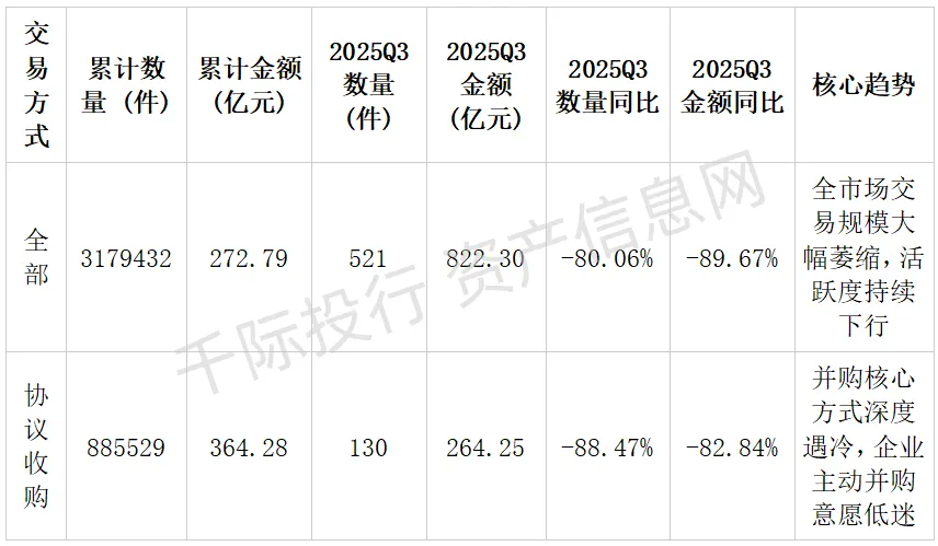 从结构维度看,协议收购、增资、资产转让三大核心交易方式是市场萎缩的主要贡献项:协议收购作为上市公司并购的核心工具,2025Q3 金额同比下滑 82.84%,反映企业主动并购意愿受尽调瑕疵、估值分歧、监管趋严等多重因素压制;增资类交易同比下滑 83.82%,体现一级市场融资环境收紧,企业股权融资难度提升;资产转让交易同比下滑 84.38%,则反映上市公司资产处置需求下降、买方市场观望情绪浓厚,交易撮合难度显著提升。