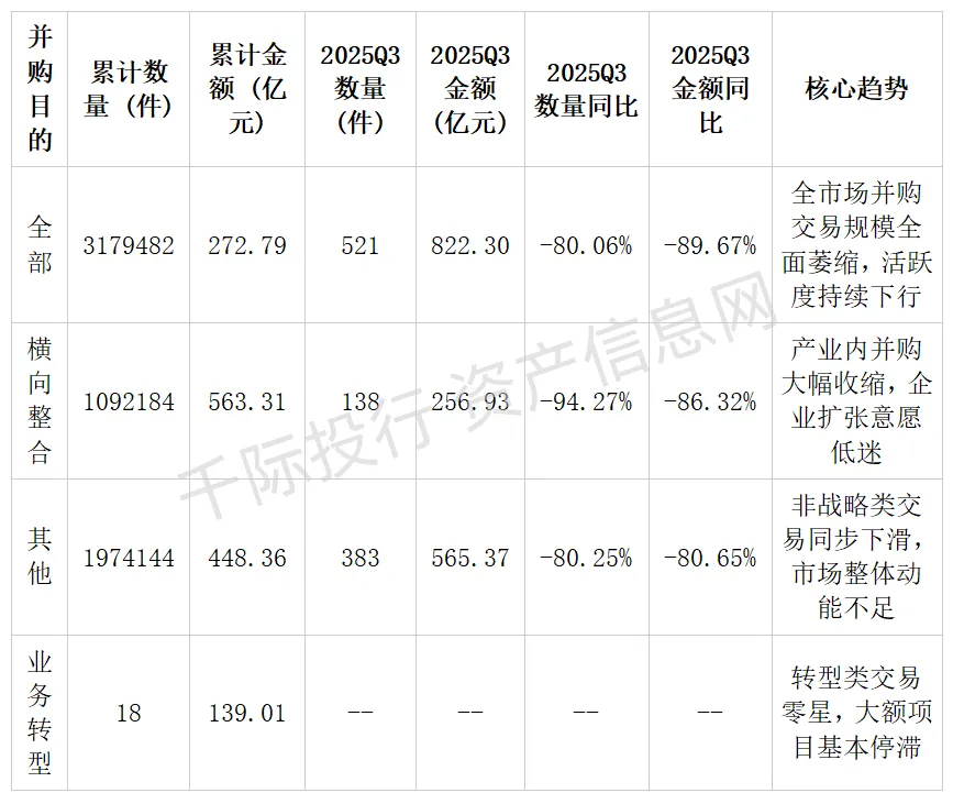 值得关注的是,“其他” 类交易虽为数量占比最高的品类,但 2025Q3 金额同比下滑 80.65%,说明非战略类、小额交易同样大幅萎缩,市场无结构性亮点。此外,业务转型、私有化、资产调整等细分目的交易规模极小、活跃度极低,进一步印证当前并购市场仅存零星交易,无持续增长动能。