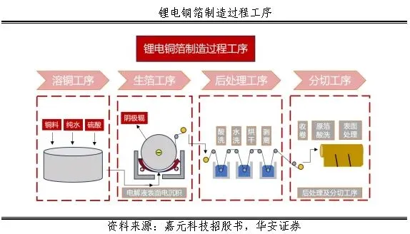电解铜箔的制造主要有四大工序,分别为溶铜,生箔,后处理和分切工序。
