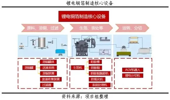 电解铜箔装备核心产品包括:溶铜罐、生箔机、阳极槽、阴极辊、防氧化机、表面处理机等生产设备如下图所示: