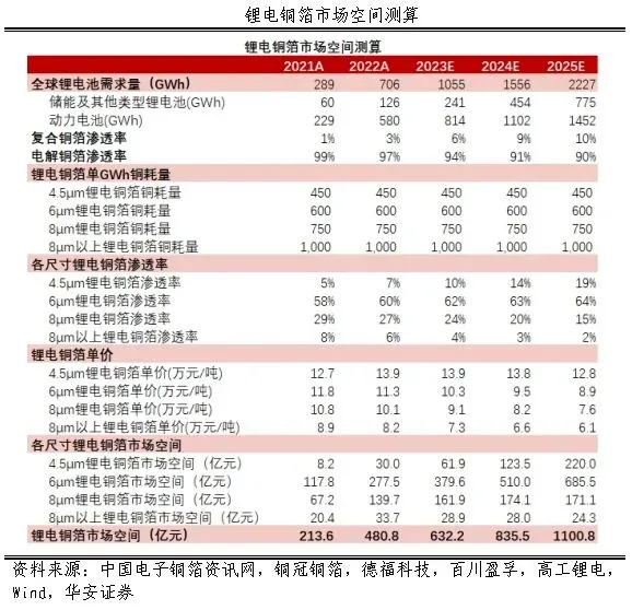 市场规模预测:动力电池需求的持续快速增长,储能电池长期趋势向好,推动锂电铜箔市场增大,基于全球锂电池需求量预测假设、各厚度尺寸锂电铜箔单GWh铜耗量、多家公司招股书披露的各厚度尺寸锂电铜箔单价、市场渗透率数据,参考单价价格下行趋势、市场渗透率逐年攀升、复合铜箔渗透率提升的情况,基于以上假设,预测未来各厚度尺寸锂电铜箔的单价与渗透率,4.5μm锂电铜箔市场空间2025年为220亿元,全球锂电铜箔市场空间2025年达到1100亿元以上。