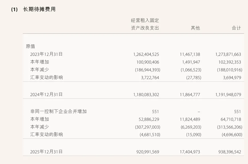 从表格中可以清晰了解到:经营租入改良部分的减少额一直在抬高。两年间“本年减少”累计高达约4.94亿元,而“本年增加”仅约1.54亿元,净减少约3.4亿元。冲销金额远超新增投入,是原值持续下降的核心驱动因素。