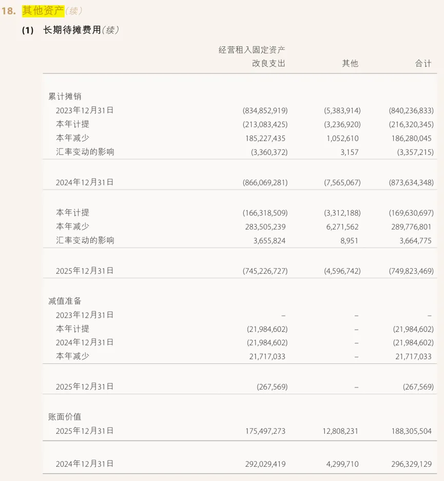 从上图中能够知晓,长期待摊费用主要分为“经营租入固定资产改良支出”和“其他”项目。前者其实很清晰——租入的固定资产改良支出,大概率是经营场所需要大修。但后者在财报中并没有细分出来。