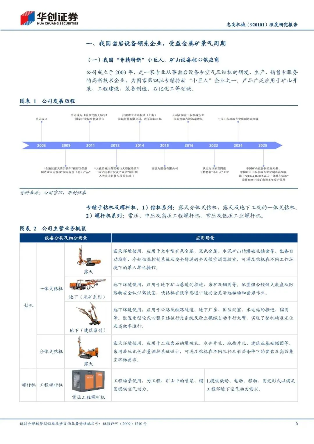 我国凿岩设备领域“专精特新”小巨人。公司成立于 2003 年,是一家专业从事凿岩设备和空气压缩机的研发、生产、销售和服务的高新技术企业。公司专注于凿岩钻机、螺杆机产品,产品广泛应用于矿山开采、工程建设、装备制造、石化化工等领域。公司是国内少数同时掌握地下钻机核心部件液压凿岩机、螺杆机核心部件螺杆主机自产能力的生产厂商。