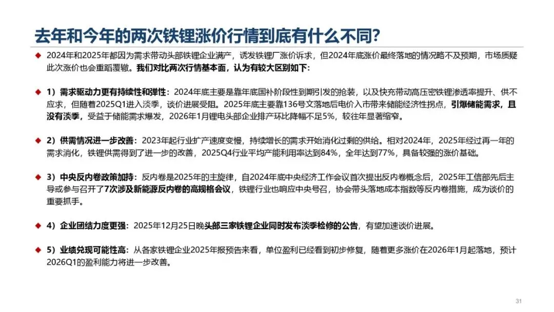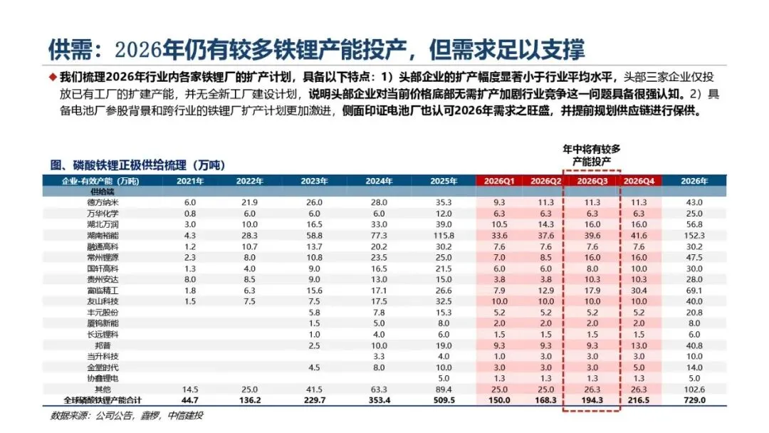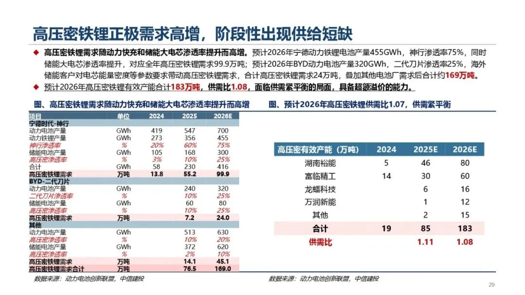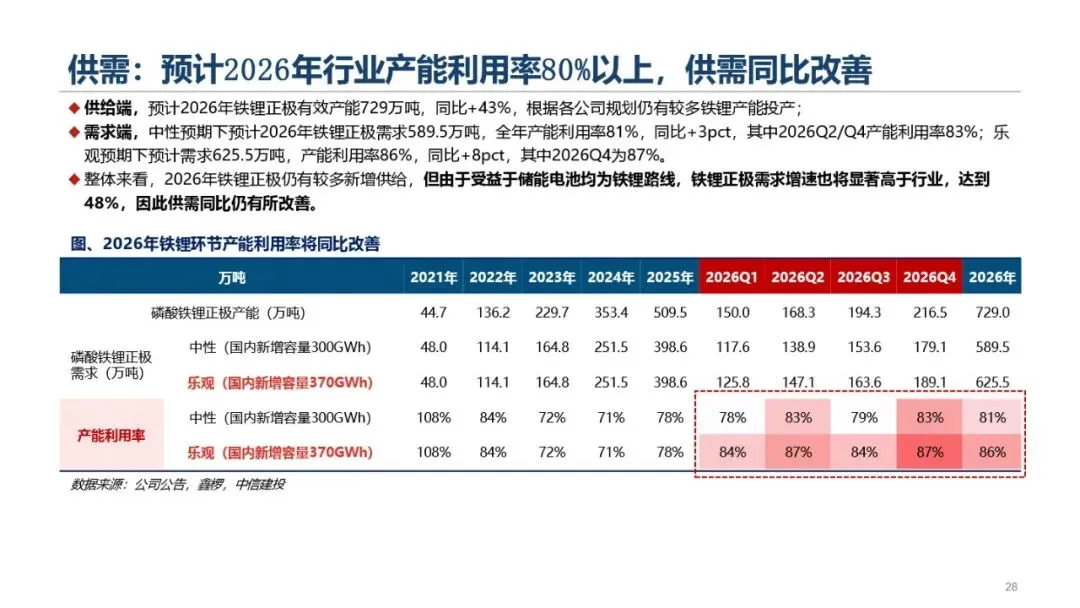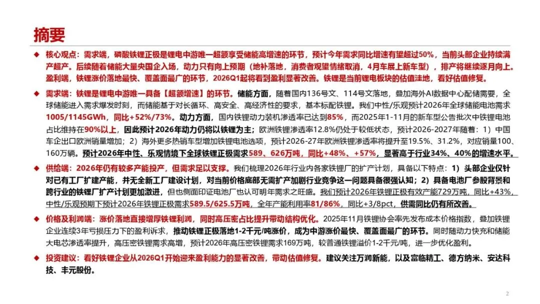 面对行业需求的快速增长,磷酸铁锂正极行业正经历着供需格局的显著改善。尽管2026年仍有较多产能投产,但受益于储能和动力市场的双重驱动,需求足以支撑新增产能,预计全年产能利用率将保持在80%以上。此外,随着高压密铁锂需求的提升,具备高压密产品生产能力的企业将迎来新的增长点。在行业反内卷政策的推动下,磷酸铁锂价格指数落地,企业盈利有望得到修复,头部企业凭借规模效应和一体化布局,将在市场竞争中占据优势地位。未来,随着新能源和储能市场的持续发展,磷酸铁锂正极行业将迎来更加广阔的发展空间。